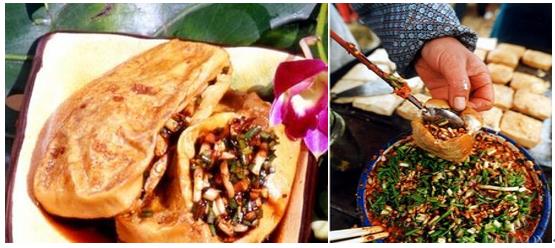 戀愛豆腐:聽起來十分浪漫的名字,貴陽的有名的風味小吃。它的主料是切成長方形小塊的白豆腐。制作時將鐵制烤床上抹油,下用糠殼作然料,將豆腐塊放在鐵烤床上后不停翻動,至皮色黃亮即可。吃時還另配內裝有醬油、味精、香醋、胡辣椒、香油、蔥花、姜未等佐料的小碟,趁熱蘸著吃。其特點是外脆內嫩、咸辣爽滑,滿口噴香,而且價廉物美、攜帶方便、節省時間,是風靡貴州的大眾小吃。